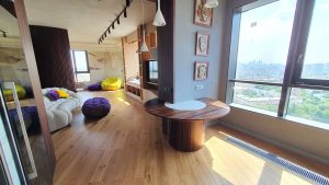 Отделка квартиры выполнена в современном минималистичном стиле с акцентом на функциональность и визуальную лёгкость пространства. Основной мебельный ансамбль отличается лаконичными формами, матовыми фасадами и сочетанием закрытых и открытых элементов, что создаёт ощущение чистоты и простора. Особую роль играет продуманная подсветка, подчеркивающая архитектуру мебели и добавляющая интерьеру глубину. Пространство кухни и гостиной объединено оригинальными решениями, включая радиусные элементы, обеспечивающие плавные переходы между зонами. Гардеробная выполнена по индивидуальному проекту с использованием массива белёного дуба и натурального покрытия масло-воск, что придаёт интерьеру теплоту и натуральность. Вентилируемые реечные фасады и современная фурнитура обеспечивают удобство хранения и соответствуют актуальным дизайнерским тенденциям.