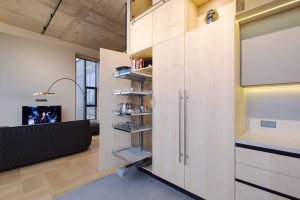 Для проекта отделки апартаментов в ЖК «Монэ» наше производство изготовило комплекс мебели из массива клёна. В интерьере использованы распашной шкаф длиной 4 метра с зоной для техники и встроенными витринами, функциональный стеллаж на 10 полок для зонирования пространства, а также кухонный гарнитур со скрытым выдвижным столом в островной тумбе. Все изделия выполнены из натурального массива европейского клёна с матовым лаковым покрытием, дополнены премиальной фурнитурой Blum и столешницами из искусственного камня. Мебель адаптирована под индивидуальные параметры объекта. Мебель объединила скандинавскую эстетику с элементами лофта и обеспечила функциональное зонирование открытой планировки.
