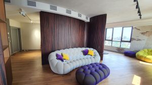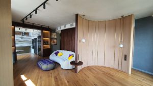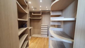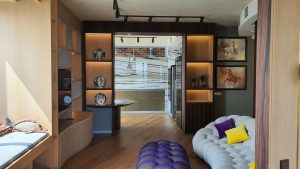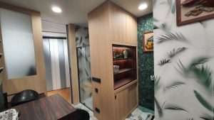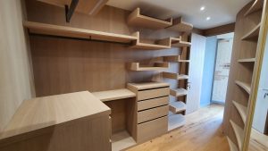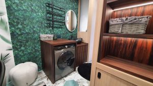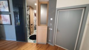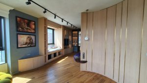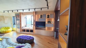 Отделка квартиры выполнена в современном минималистичном стиле с акцентом на функциональность и визуальную лёгкость пространства. Основной мебельный ансамбль отличается лаконичными формами, матовыми фасадами и сочетанием закрытых и открытых элементов, что создаёт ощущение чистоты и простора. Особую роль играет продуманная подсветка, подчеркивающая архитектуру мебели и добавляющая интерьеру глубину. Пространство кухни и гостиной объединено оригинальными решениями, включая радиусные элементы, обеспечивающие плавные переходы между зонами. Гардеробная выполнена по индивидуальному проекту с использованием массива белёного дуба и натурального покрытия масло-воск, что придаёт интерьеру теплоту и натуральность. Вентилируемые реечные фасады и современная фурнитура обеспечивают удобство хранения и соответствуют актуальным дизайнерским тенденциям.